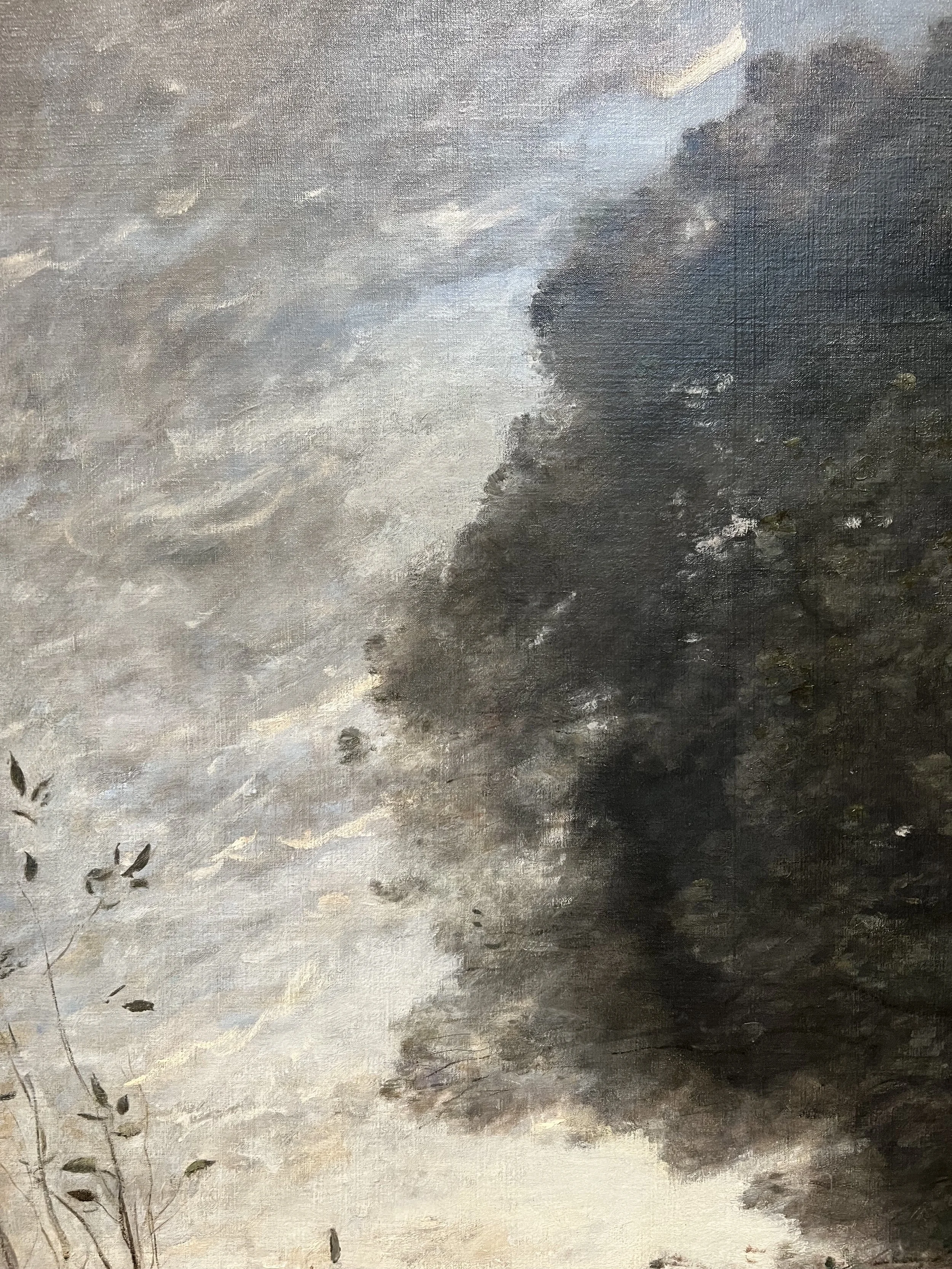 Corot’s hand is extraordinary in its subtlety. The trees are massed, yet their edges soften and breathe. The foliage dissolves into atmosphere. He massages the surface without contrivance. Nothing feels labored. Nothing feels overly announced.