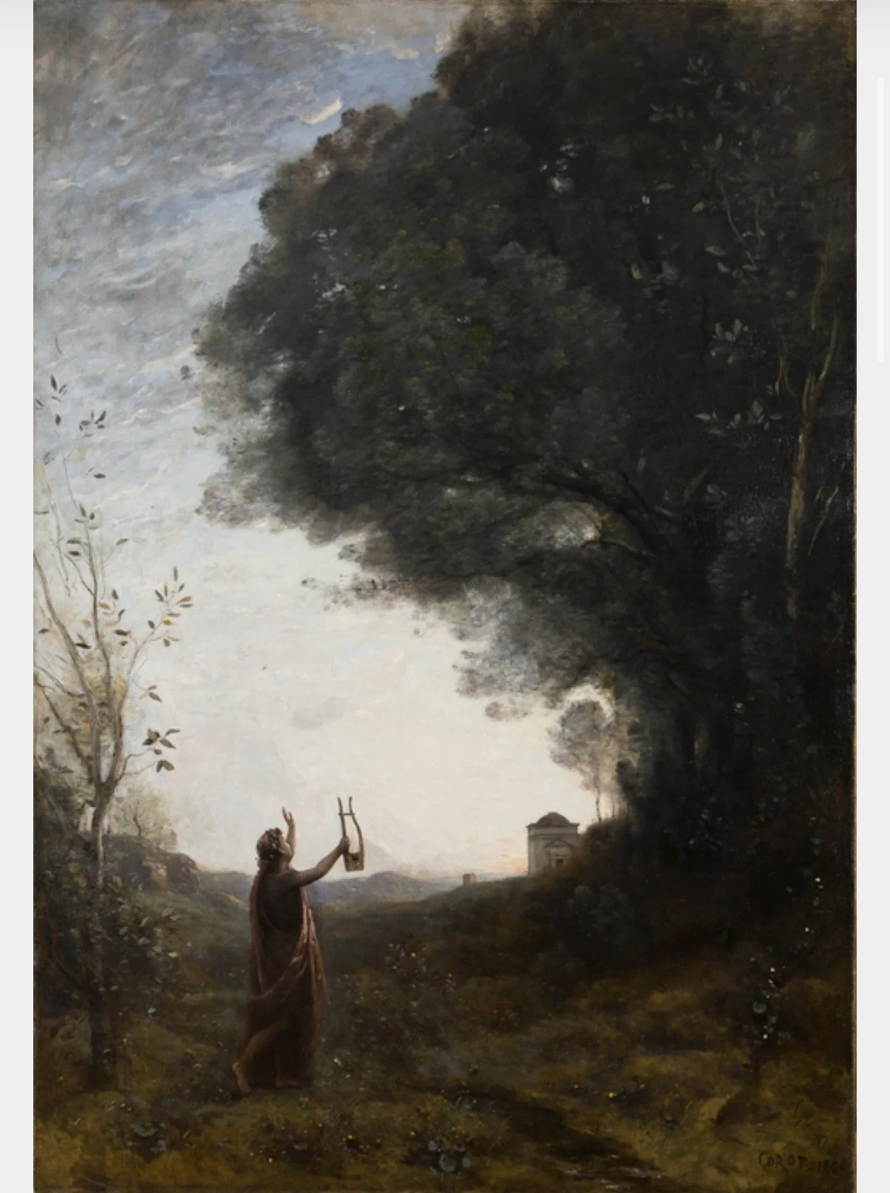 Standing in front of it, I feel the humility of scale. Orpheus, the quintessential artist, the mythic musician who could enchant animals, rocks, even the underworld, is small. He raises his lyre toward Apollo, toward light, toward art itself. And yet Corot shows us something larger than artistic genius. There is an all-pervasive space that exceeds the hero’s control.