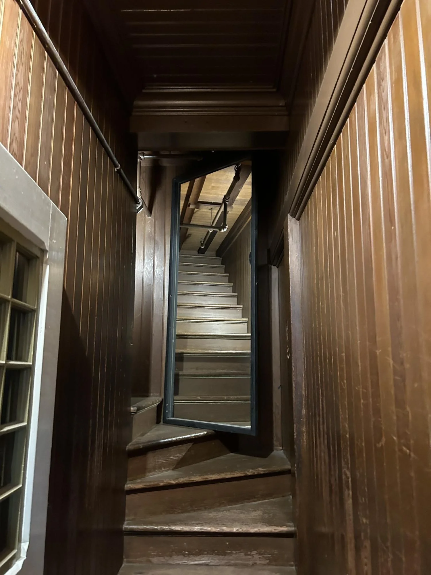The structure recalls something like the Winchester Mystery House, with its endless additions, staircases leading nowhere, and rooms built for unseen presences. There is also a theatrical and slightly uncanny quality, reminiscent of The Cabinet of Dr. Caligari, where architecture itself becomes psychological.