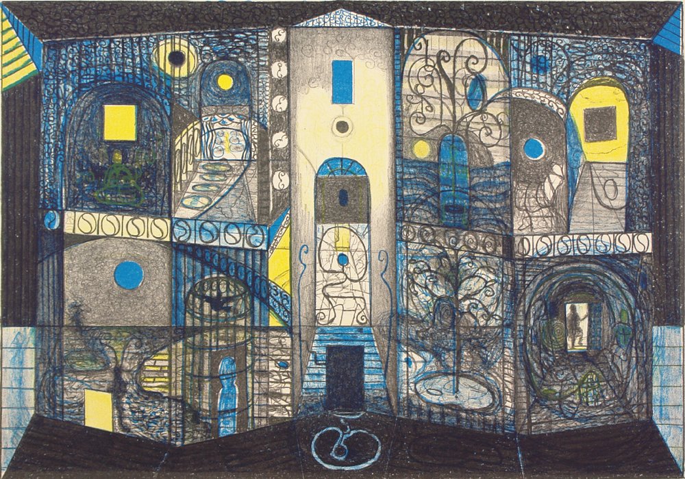The image presents something like an architectural structure, perhaps a playset or a paper maquette, but one that feels unsettled, almost nightmarish. It evokes a kind of waking dream or a psychic diagram. The space is divided into multiple compartments, roughly symmetrical yet internally unstable. Each room contains its own logic, its own marks and rhythms, yet none of them fully resolve.