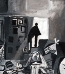 And then there is the figure in the doorway at the lower right, one of the few clearly legible forms in the composition. This figure immediately recalls the doorway figure in Las Meninas by Diego Velázquez. In that painting, José Nieto Velázquez stands at the threshold between spaces, suspended between entering and leaving, interior and exterior. Pablo Picasso, in his reworking of Las Meninas, retained and emphasized this figure as a crucial structural and psychological element.