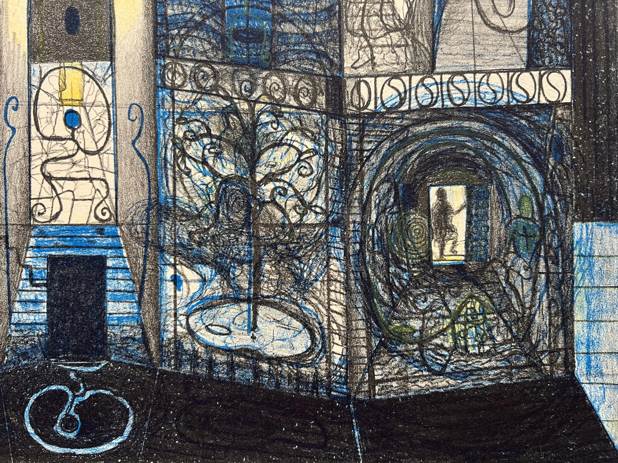 It reminds me of the kind of drawing a child might make when asked to depict a house, except here the structure is fractured, recursive, and deeply interiorized. Lines break across planes, spatial boundaries collapse, and each compartment opens into further dimensions. There is no stable ground. Instead, there are layers of marks, trails, and reversals that both construct and undo the space at the same time.